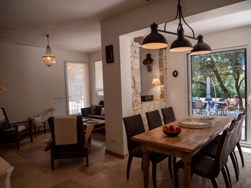 Outside, tables and chairs are laid out on a beautiful terrace shaded by a majestic oak tree, the ideal place for your aperitifs and meals. There is also a covered area for outdoor cooking, with a gas griddle and pizza oven.